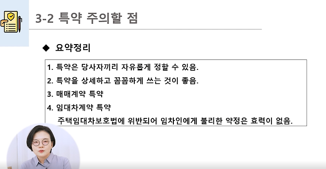 지금까지 전세계약서 작성 시 주의사항 중 특약에 대해 알아봤습니다. 특약은 당사자끼리 자유롭게 정할 수 있는 권리이기 때문에 상세하고 꼼꼼하게 쓰는 것이 좋습니다. 특히 임대차계약(전월세계약)의 경우 주택임대차보호법에 위반되어 임차인에게 불리한 조항은 효력이 없음을 알고 계시면 좋을 듯합니다.