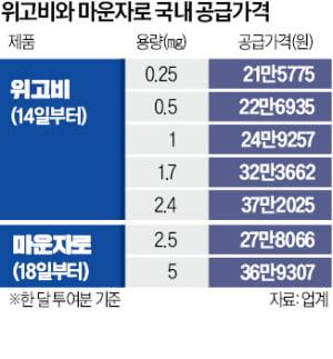 이날 의료 현장에서 마운자로 2.5㎎은 30만~35만원, 5㎎은 40만~45만원 정도에 판매됐다. 위고비는 0.25㎎ 저용량이 22만~28만원, 최고 용량인 2.4㎎은 39만~42만원 정도에 판매됐다. 서울에서 약국을 운영하는 한 약사는 “출고가가 공개돼 가격을 많이 높이긴 어려울 것이라고 판단하고 있다”며 “환자 수요가 크기 때문에 두 회사 모두 국내에 물량을 얼마나 가져올 수 있을지가 중요할 것”이라고 했다.