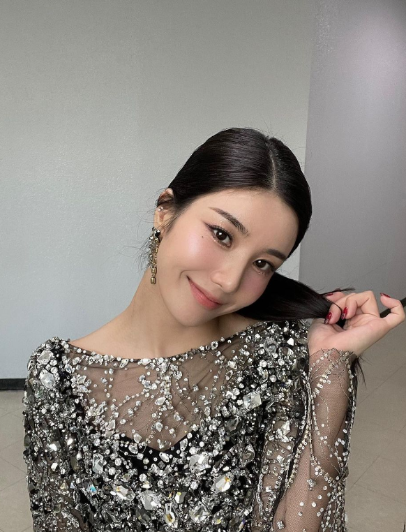 권은비는 비즈가 화려하게 달린 미니 드레스를 입고 키가 커 보이는 스타일링을 완성했습니다.