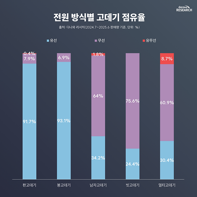 고데기의 전원 방식은 제품군 성격을 그대로 반영한다. 우선 판고데기(유선 91.7%)와 봉고데기(유선 93.1%)는 압도적으로 유선이 많다. 안정적인 출력과 정밀한 열 제어가 중요하기 때문에, 콘센트에 꽂고 쓰는 방식이 여전히 기본이다.
