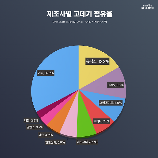 눈에 띄는 건 기타 브랜드가 32.9%로 가장 큰 비중을 차지하고 있다는 점이다. 이는 특정 기업이 시장을 독점하기보다는 다양한 브랜드가 공존하며 경쟁하는 구조임을 보여준다. 특히 온라인을 기반으로 한 중소 브랜드와 신생 업체들이 꾸준히 늘어나면서 시장이 세분화되는 모습이다.