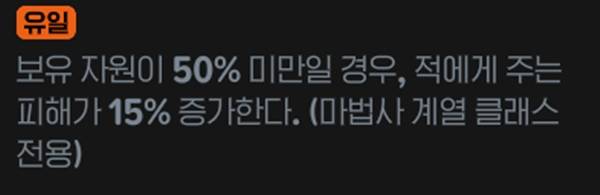 마법사 계열 전용으로 자원이 50% 미만일 경우 공격력 증가 15%를 얻는다. 전투 도중 발동 조건 만족이 매우 쉽다는 장점이 있다.