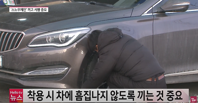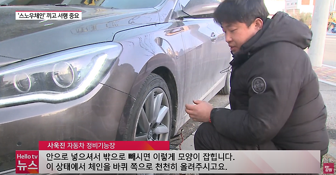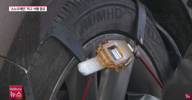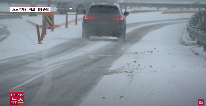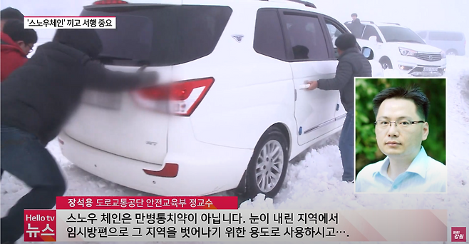 "스노우 체인은 만병통치약이 아닙니다. 눈이 내린 지역에서 임시방편으로 그 지역을 벗어나기 위한 용도로 사용하시고…안전한 지역에서는 얼른 체인을 벗겨 내는 것이…(필요하고) 서행 운전하시는 게 제일 좋은 안전 운전 요령입니다.”
