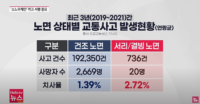 최근 3년간 노면에 따라 발생한 교통사고 사망자 수를 비교해 보면 건조 노면보다 서리, 결빙 상태 노면에서의 사고 치사율이 2배 더 높습니다.