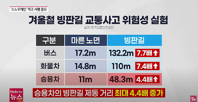 빙판길에서의 사고가 위험한 데는 차량 제동거리와 관련이 있습니다.