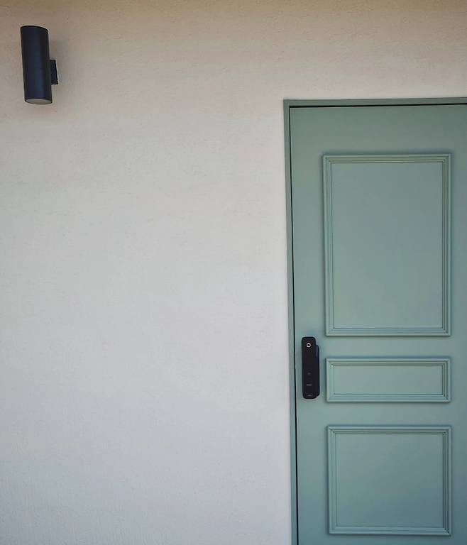 전체적인 집 외관은 화이트 컬러로 스타코 시공을 했습니다. 현관은 조금 컬러감을 주고 싶어 민트 컬러로 페인팅을 해 봤어요. 기존 현관문이 비규격 사이즈라 새 문 대신 온라인으로 셀프 웨인스코팅을 검색해 문에 붙이고 페인팅 마감을 했습니다.