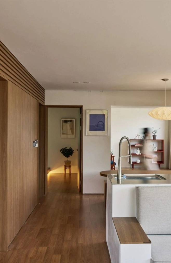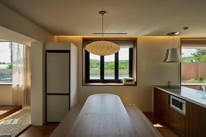 세컨하우스이기때문에 주방은 심플하게 꾸몄어요. 중앙에 싱크대를 설치해서 거실과 다이닝 공간으로 나눠 두었죠.