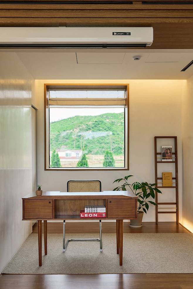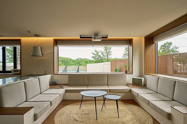 전체적인 높이를 고려한 덕분에 어디에 앉아도 눈에 거슬리는 가구나 물건이 없어요. 세컨하우스의 가장 큰 매력이죠.