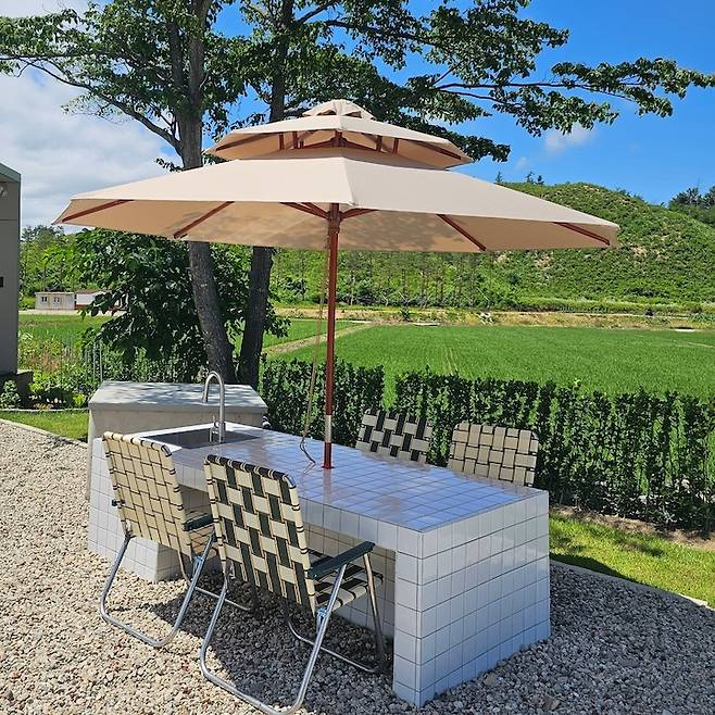 마당 테이블에 싱크대를 설치한 건 정말 잘 한 것 같아요. 바베큐를 하면서도 텃밭에서 수확한 야채들을 바로바로 씻어 먹을 수 있어서 정말 편하거든요.
