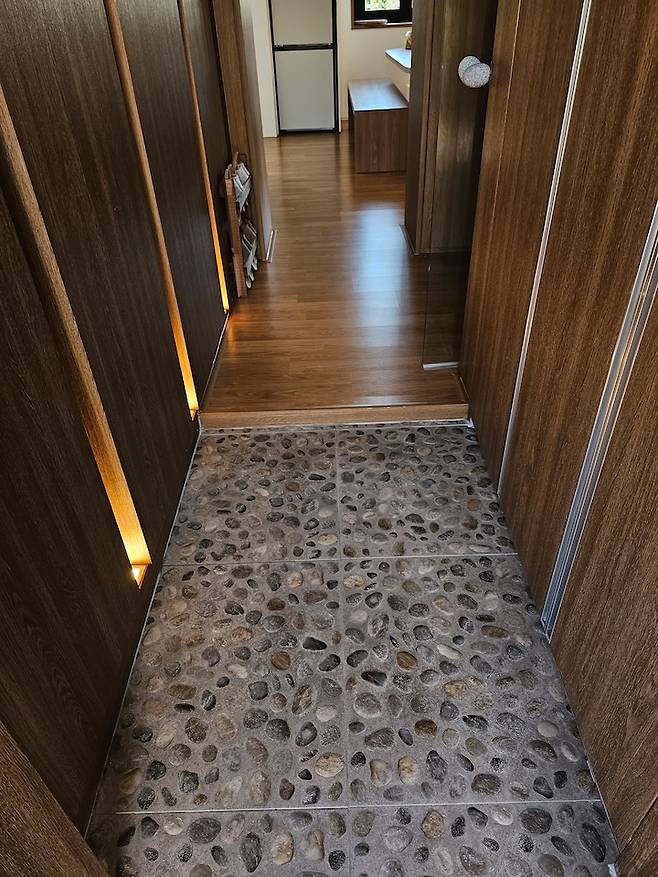 우여곡절이 많았던 현관 바닥 타일 이에요. 너무 맘에 드는 윤현상재 제품인데 홈페이지에 품절로 되어있더라고요. 고객센터로 문의하니 공장에 4박스가 남아 있다고 하셔서 고성에서 경기도 공장까지 직접 가서 2박스를 공수해 왔습니다.