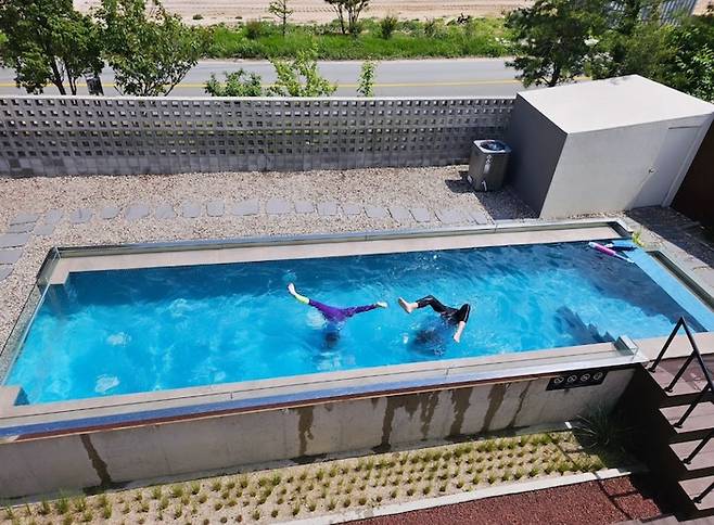 울산 바위를 바라보며 특별한 수영장을 만들고 싶어 특수 아크릴을 끼우고 봄, 가을까지 이용할 수 있도록 여과기와 히팅기, 가스보일러를 설치를 했어요.