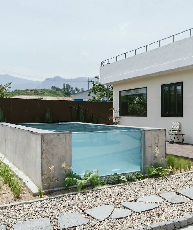 세컨하우스의 장점은 도면에서 보여지는 것처럼 수영장이 있다는 것과 거실과 주방, 주방과 서재 등 방이 열린 구조로 설계돼 있다는 점입니다.