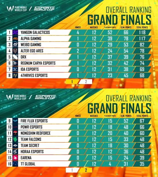 파이널 2일 차 일정을 마친 결과, 4치킨 포함 118점을 가져간 양곤 갈락티코스가 1위 자리를 지켰다.