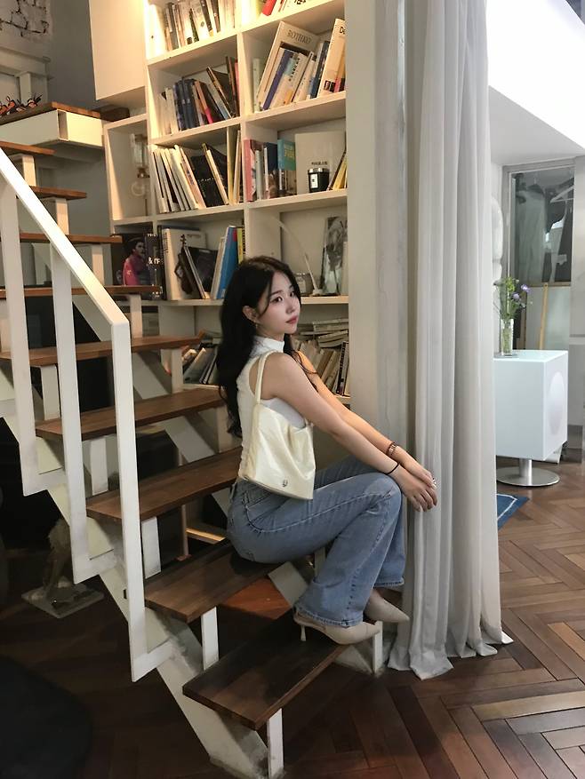 이날은 민소매 화이트 나시와 하이웨스트 부츠컷 데님을 매치해