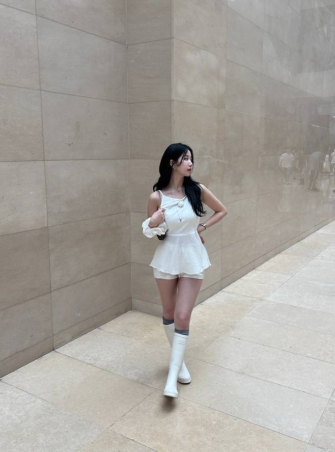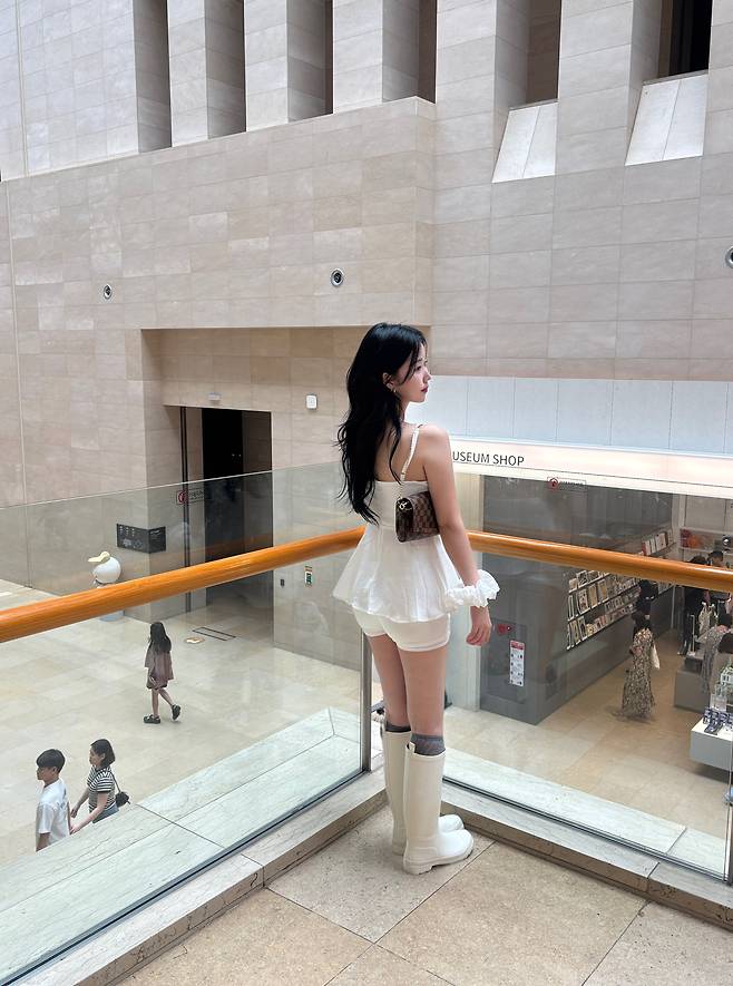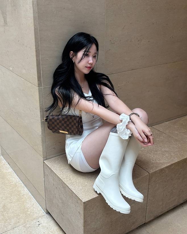날씨가 갑자기 변해 소나기가 내릴지도 몰라서, 화이트 컬러의 롱부츠 장화를 매치했어요.