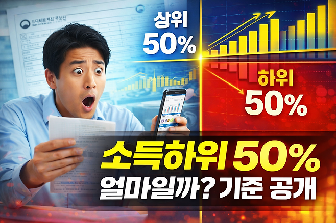 정부 지원 제도를 알아보다 보면 소득하위 50% 이하라는 조건을 자주 보게 됩니다. 청년 지원, 교육급여, 차상위계층, 각종 생활 지원 제도를 살펴보실 때 빠지지 않고 등장하는 기준이라서 한 번쯤은 꼭 정확하게 이해해두시는 것이 좋습니다. 처음에는 저도 소득하위 50%라고 하면 월급이 적은 사람만 해당되는 줄 알았습니다. 그런데 실제로 기준을 확인해보니 월급만으로 판단하는 것이 아니라 소득인정액이라는 항목으로 따지기 때문에 생각보다 훨씬 복잡했습니다. 특히 예금이나 자동차, 전세보증금 같은 재산까지 함께 반영된다는 점에서 많은 분들이 헷갈릴 수밖에 없겠다는 생각이 들었습니다.