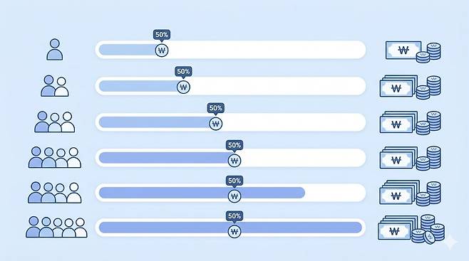 소득하위 50%라는 표현은 많이 쓰이지만, 실제로는 기준 중위소득 50% 이하를 뜻하는 경우가 대부분입니다. 여기서 중위소득은 우리나라 전체 가구를 소득 순서대로 줄 세웠을 때 정가운데에 있는 가구의 소득을 말합니다. 평균소득과는 다른 개념입니다. 평균은 고소득 가구의 영향으로 높아질 수 있지만, 중위소득은 실제 생활 수준을 반영하는 데 더 적합하다고 여겨집니다. 결국 소득하위 50%라는 말은 이 기준 중위소득의 절반 이하에 해당하는 가구를 의미한다고 이해하시면 됩니다. 정부 지원 제도에서 이 기준을 쓰는 이유도 상대적으로 생활 여건이 어려운 가구를 선별하기 위해서입니다.