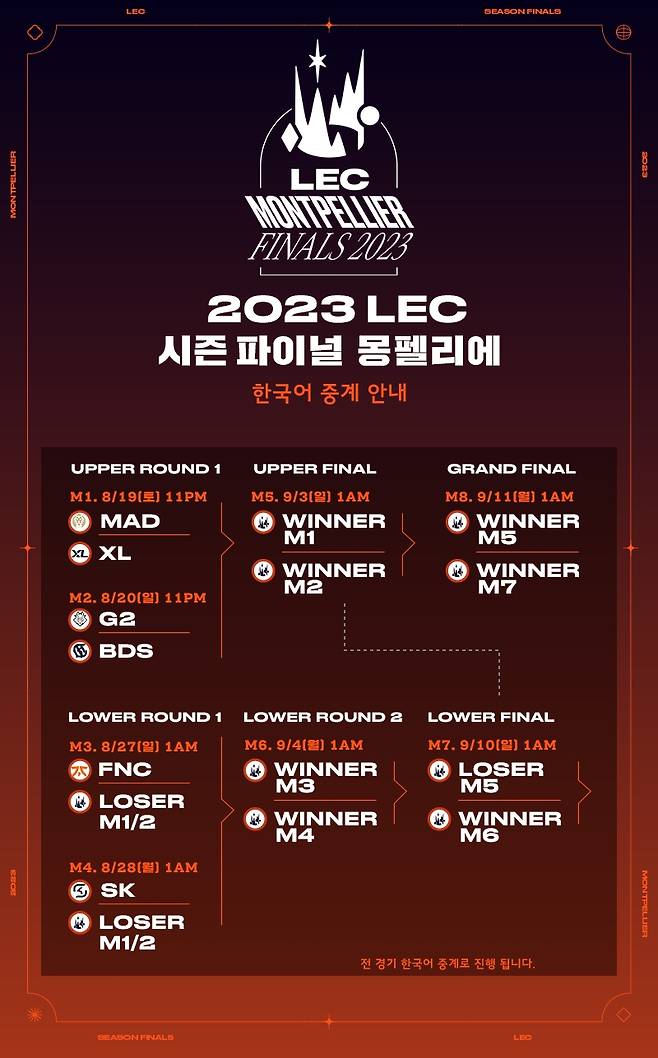 LEC 시즌 파이널은 오는 8월 19일(토) 오후 11시, 승자조에 안착한 ‘G2 Esports’와 ‘Team BDS’의 경기로 막을 연다. 경기는 각 팀이 5판 3선승제로 맞붙어 두 번 패배하는 팀은 탈락하는 '더블 엘리미네이션 토너먼트' 형태로 치러진다. 한국어 중계진으로는 박상현, 박한얼 캐스터와 빛돌, 린다랑 해설이 참여해 다양한 조합의 중계를 선보일 예정이다.