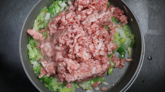 1. 팬을 달군 뒤 다진 돼지고기를 넣고 중불에서 5~6분간 볶아 고기의 기름이 나오도록 한다.