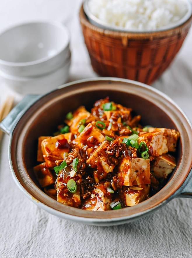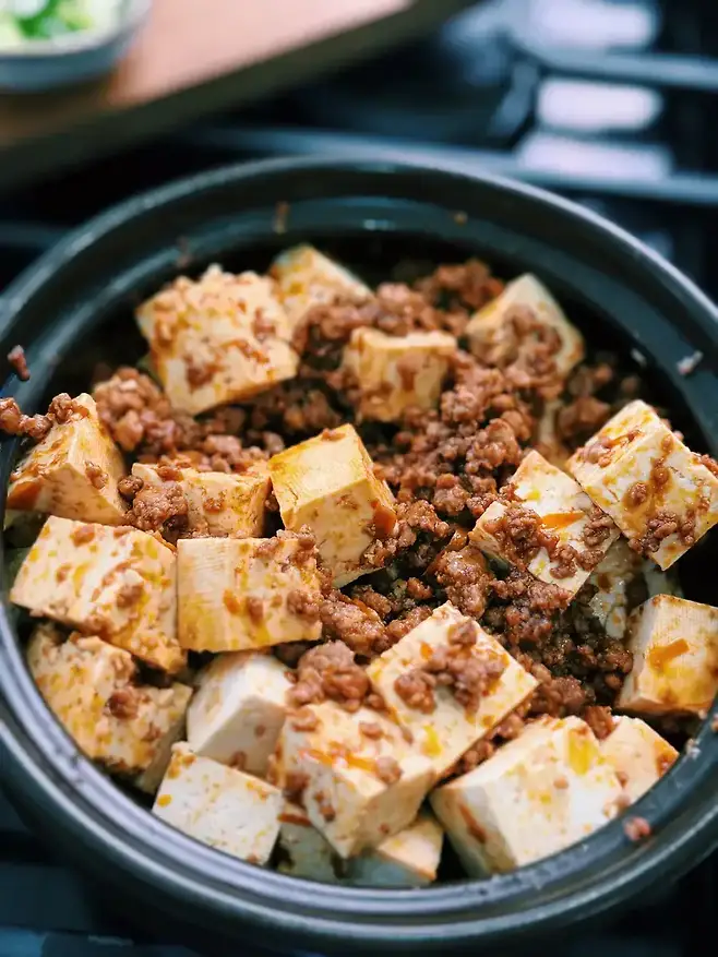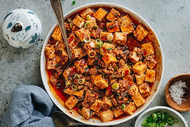 두부 1모(약 400g, 부드러운 두부나 보통 두부), 다진 돼지고기 400g, 다진 파·마늘 약간, 고추기름 1큰술, 간장 3큰술, 굴소스 1큰술, 고춧가루 1큰술, 고추장 1큰술, 육수 1컵(또는 물), 청양고추·홍고추 약간, 전분물(전분 1큰술+물 2큰술)