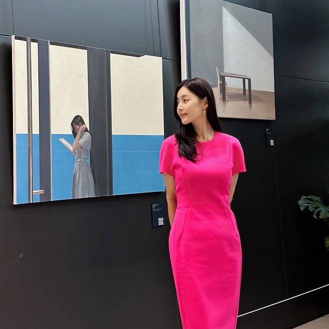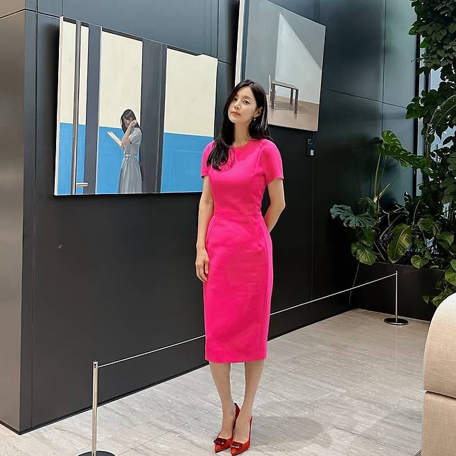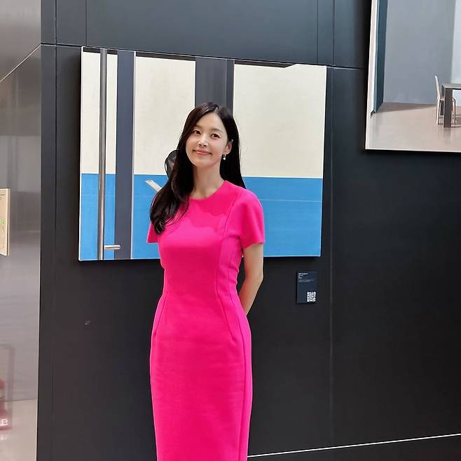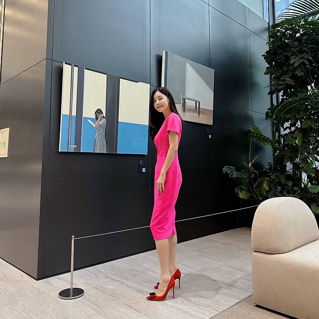 두 번째 룩은 선명한 핫핑크 미디 드레스로, 단정한 실루엣이 지적이고 세련된 이미지를 완성했습니다.