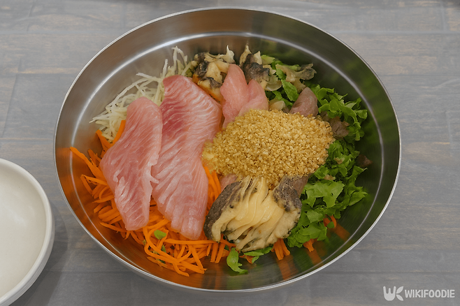 대표 메뉴는 단연 물회다. 새콤한 양념장에 오징어, 뽈락, 해삼, 멍게 등이 듬뿍 들어가고, 얼음 육수가 곁들여져 시원하게 즐길 수 있다. 특히 독도뽈락을 넣은 일반물회는 신비섬횟집의 인기 메뉴로, 깊은 감칠맛이 남는다. 바다의 향이 입안 가득 퍼지고, 신선한 해산물의 식감이 살아 있다. 식사 후에는 따뜻한 전복죽을 함께 주문하는 손님이 많다. 전복이 큼직하게 들어가 고소하고 진한 풍미가 오래 남는다.