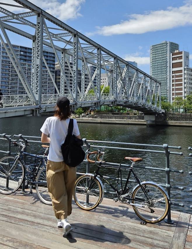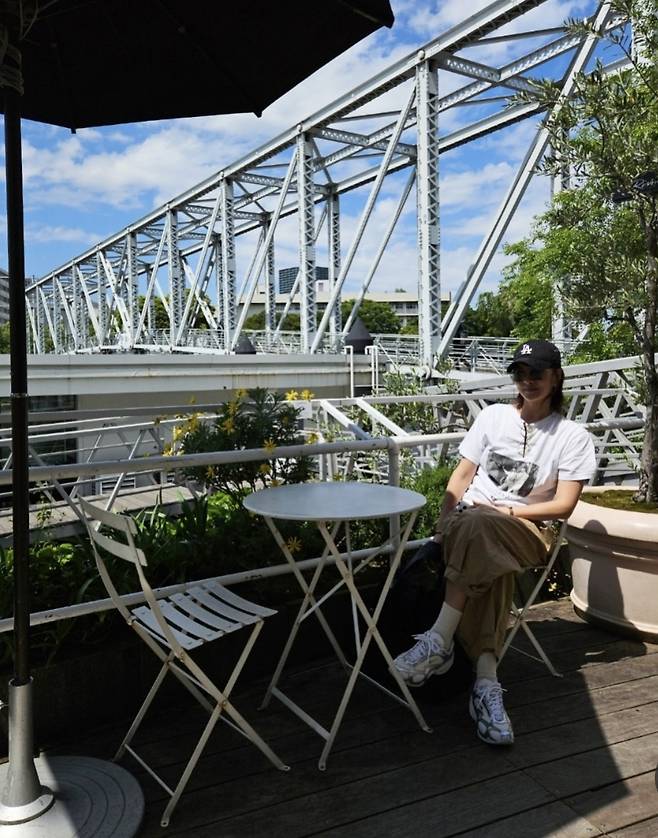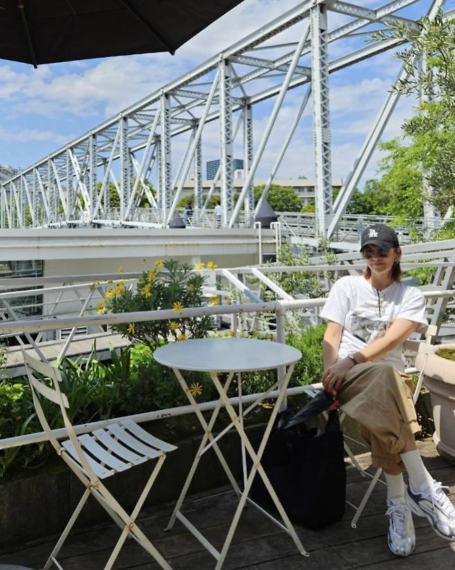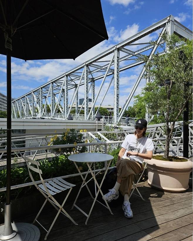 전체적으로 뉴트럴 톤으로 안정감을 주며, 도시적 배경과 조화를 이루는 여유로운 여행룩을 선보였습니다.