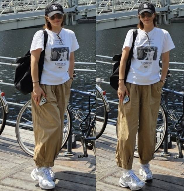 김선아는 프린트 티셔츠와 루즈핏 베이지 팬츠로 편안하면서도 감각적인 캐주얼룩을 완성했습니다.