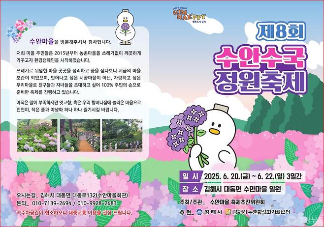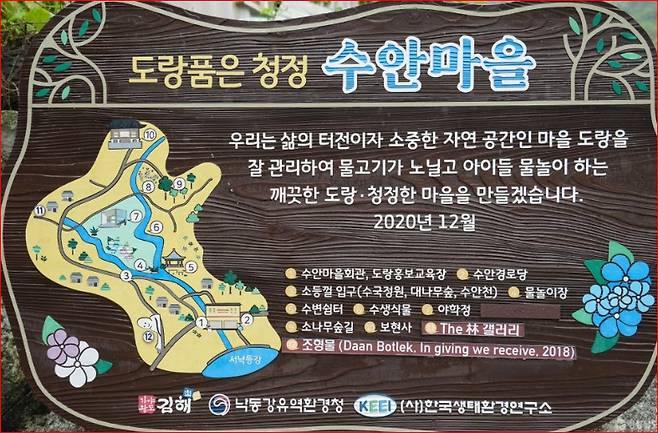 김해시 대동면 수안리에 자리한 수안마을은 그 자체로 하나의 정원입니다. ‘주고받는 것은 생명입니다’라는 주제로 조성된 마을 입구의 벽화부터, 정갈하게 손질된 골목길과 화단들까지.