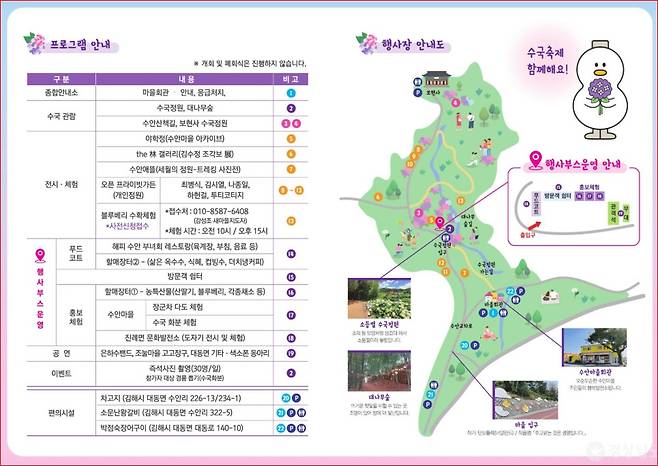 6월20~6월22일이면 수안마을은 연보라빛 수국이 흐드러지게 피며, 지역 주민들이 함께 만들어가는 수국축제가 열립니다. 커다란 수국 군락 사이를 걷다 보면 포토존이 곳곳에 마련되어 있고, 마을 주민들이 직접 만든 연근과자, 연근피클 등의 특산품도 판매하고 있어 눈과 입이 모두 즐거운 시간이 이어집니다.