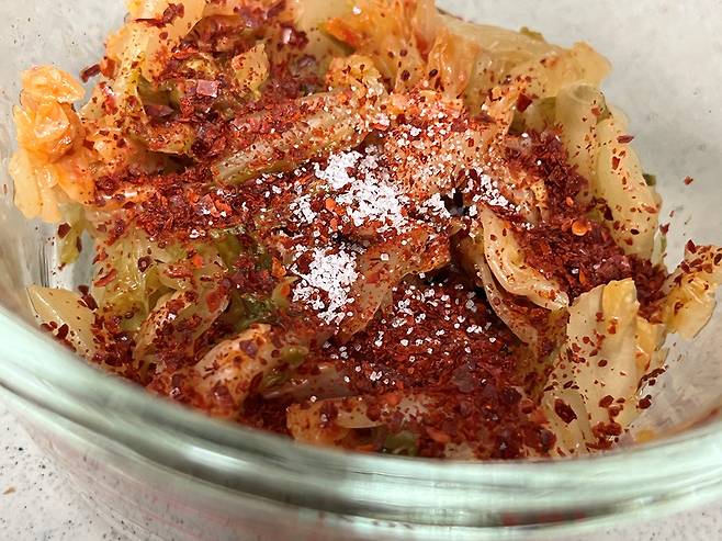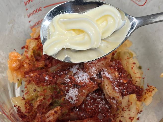 여기에 고춧가루 고춧가루 1/2스푼과 설탕 1/2 커피 스푼을 넣어 주세요. 신김치라면 설탕을 꼭 넣어야 신맛이 완화됩니다.