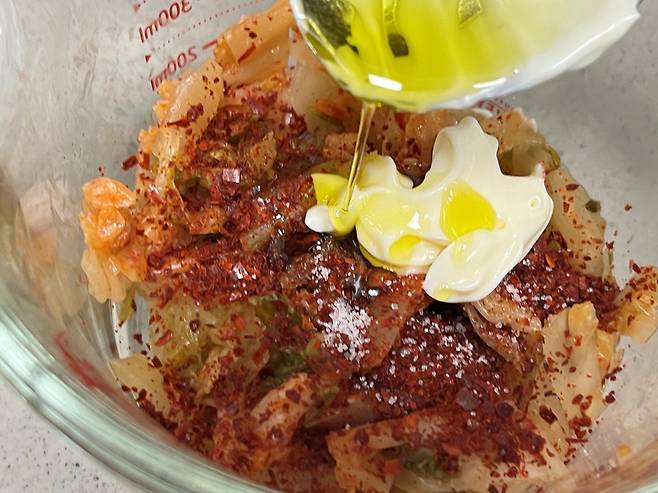 여기에 올리브오일 1스푼을 넣으세요. 올리브오일을 미리 넣으면 식용유 두를 필요가 없습니다. 김치와 양념들을 잘 섞어주세요.