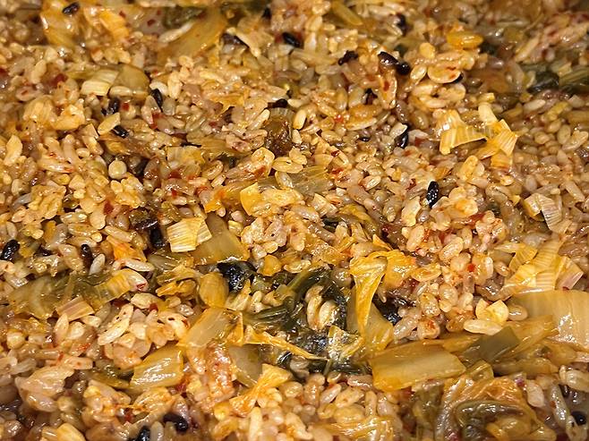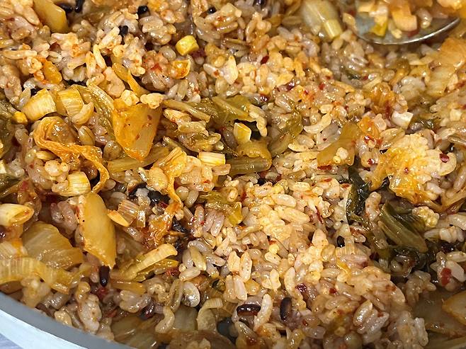여기에 밥을 넣어서 골고루 비벼 주세요. 김치만 넣어서 볶음밥을 만들면 깔끔하고 매콤한 맛이 나고, 여기에 살짝 기름기나 감칠맛이 더 필요하다면 햄 등을 넣어 주세요.