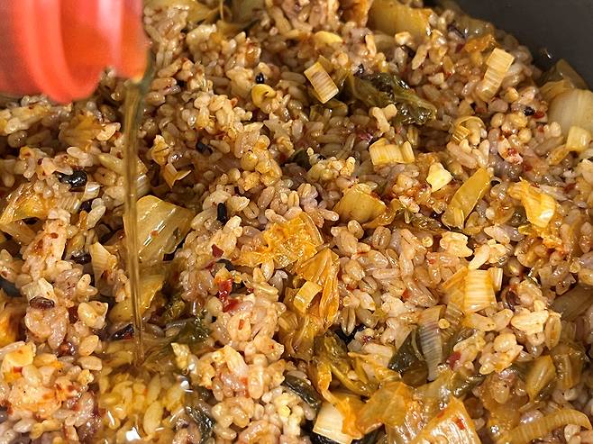 마지막에 참기름 1~2스푼을 넣어 마무리합니다. 참기름을 볶음밥이 완성된 후 넣어야 고소한 향이 잘 살아나요.