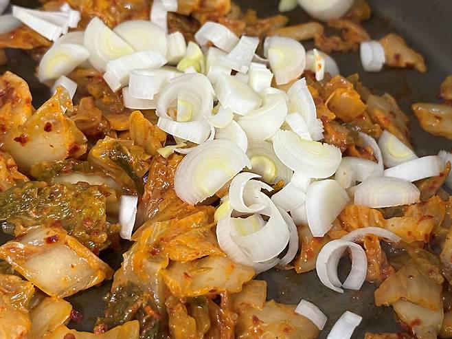 팬에 김치와 양념 섞은 것을 넣고 볶다가 김치가 익으면 대파 잘게 썬 것을 넣고 함께 볶아 주세요. 팬에 아무것도 두르지 않고 볶으시면 됩니다.
