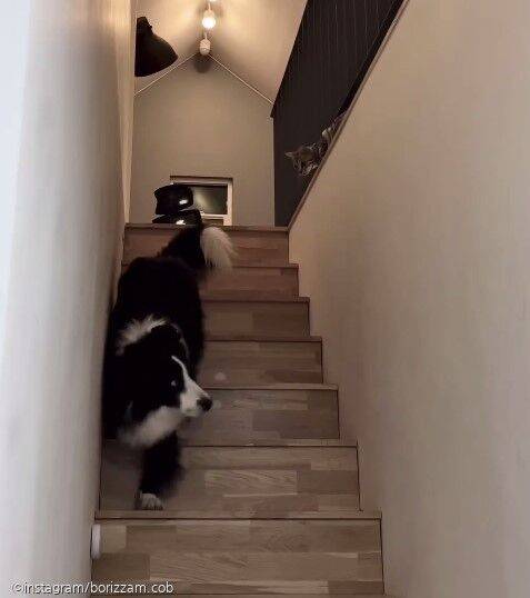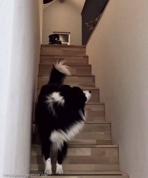 그 뒤로 보리는 연휴 내내 고양이 눈치를 보기 시작했다. 지난 29일 다히 씨가 자신의 인스타그램에 올린 영상 속 보리는 계단을 내려가면서 난간 위에 누워 있는 고양이 눈치를 보는 모습이다.