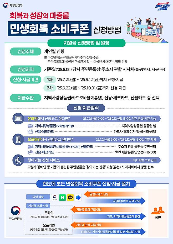 7월 21일부터 ‘민생회복 소비쿠폰’ 신청이 시작된다. 민생회복 소비쿠폰은 1, 2차로 나눠 지급되며, 1차로 1인당 최소 15만 원 상당(차상위·한부모가족 30만 원, 기초생활수급자 40만 원)의 소비쿠폰이 지급될 예정이다.