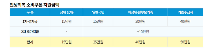 1차 민생회복 소비쿠폰 지원금액은?1차 민생회복 소비쿠폰은 전 국민에게 지급되며, 소득 수준에 따라 지원금액이 달라진다.