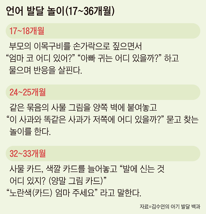 생후 17개월부터 36개월까지 아이의 언어 이해력은 매우 빠른 속도로 발달한다. 아이가 ‘엄마’ ‘아빠’ 등 말을 시작하면 부모가 기대감에 더 많은 말을 하도록 유도하기도 한다. 하지만 무리하게 말하도록 하기보다는, 부모의 말을 얼마나 잘 이해하고 있는가에 초점을 맞추면서 차분하게 이끌어주는 게 좋다.