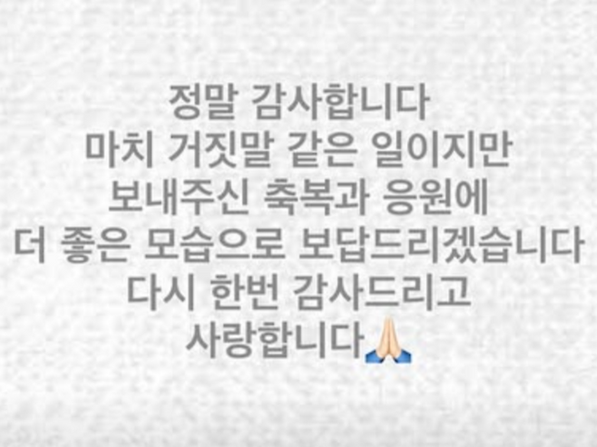 배우 이태리는 1일 자신의 SNS를 통해 “정말 감사합니다. 마치 거짓말 같은 일이지만 보내주신 축복과 응원에 더 좋은 모습으로 보답드리겠다”며 “다시 한번 감사드리고 사랑한다”고 밝혔다.