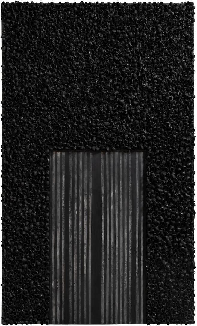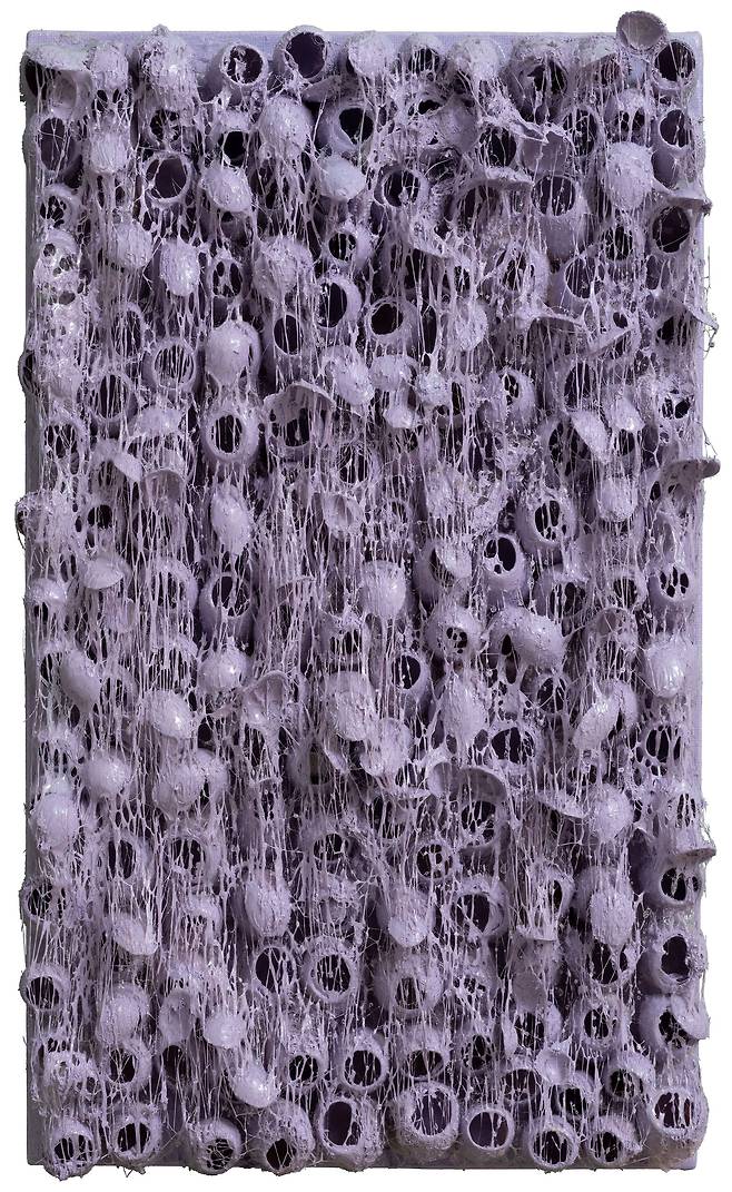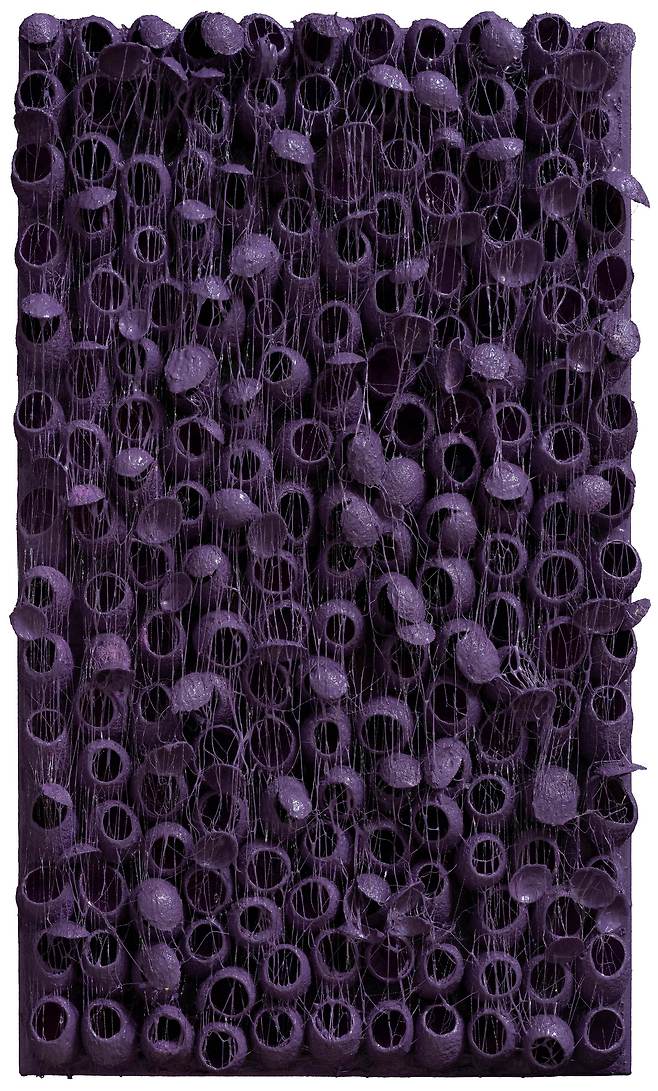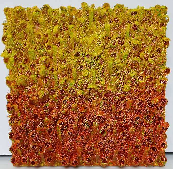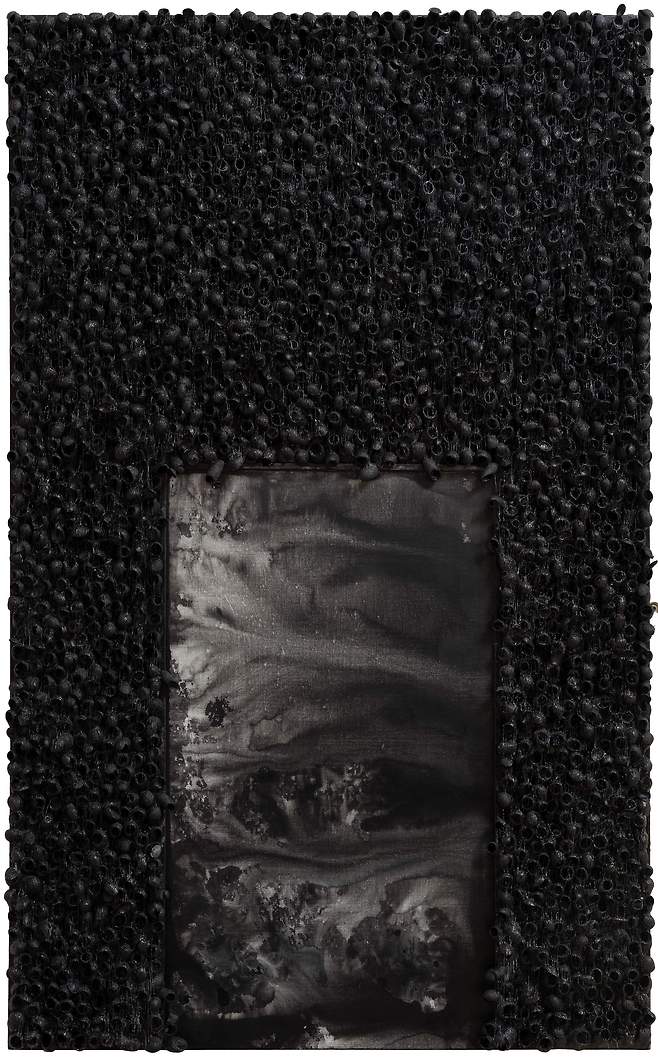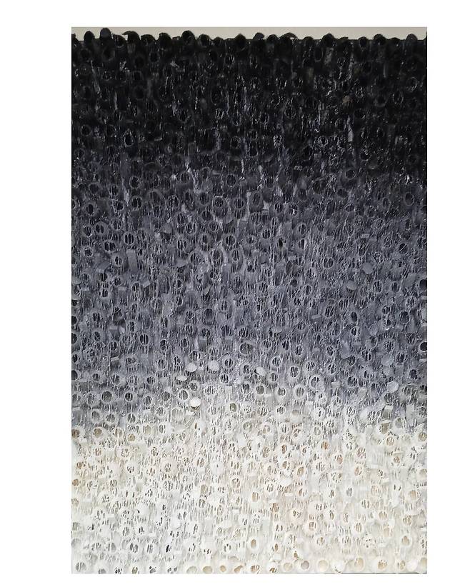 실제 누에고치를 오브제로 사용하여 캔버스에 누에고치를 콜라주 후 와이어 브러쉬로 수천번 긁어내어 실을 뽑아 올리는 연속과 반복적인 작업으로 수행과 진정성에 심도를 높였다.