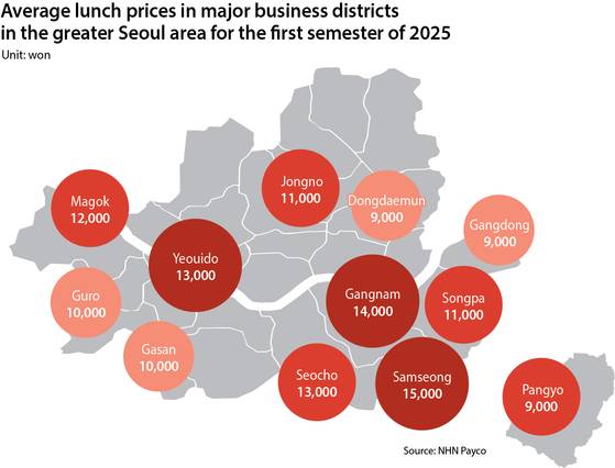 In Gangnam District and Samseong-dong, the average meal now costs 14,000 and 15,000 won, according to NHN Payco, respectively — up about 1,000 won from last year. Prices in western Seoul's Yeouido and southern Seoul's Seocho District averaged 13,000 won. A weekday lunch at Ashley Queens is just 19,900 won, meaning diners can pay just a few thousand won more for all-you can eat access to more than 200 menu items.