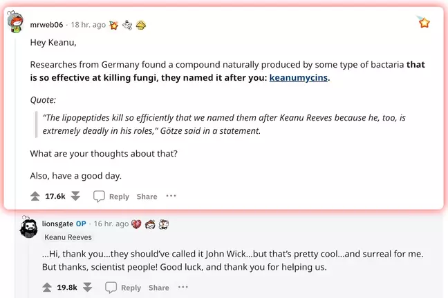 지난 7일 미국 워싱턴포스트를 비롯한 외신에서는 독일 예나에 위치한 ‘라이프니츠 자연물 및 감염 생물학 연구소'의 연구원들이 새 항균 물질의 이름을 ‘키아누마이신’(keanumycins)'이라고 지었다고 발표했는데요.