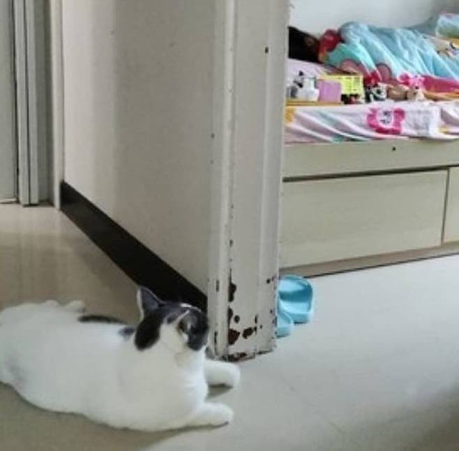 무엇보다 특히 아이 방에 들어가지 않고 문앞에 덩그러니 자리잡고 앉아서 침대 위에서 자고 있는 아이를 바라보며 일어나기만을 기다려주는 고양이.