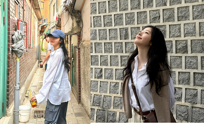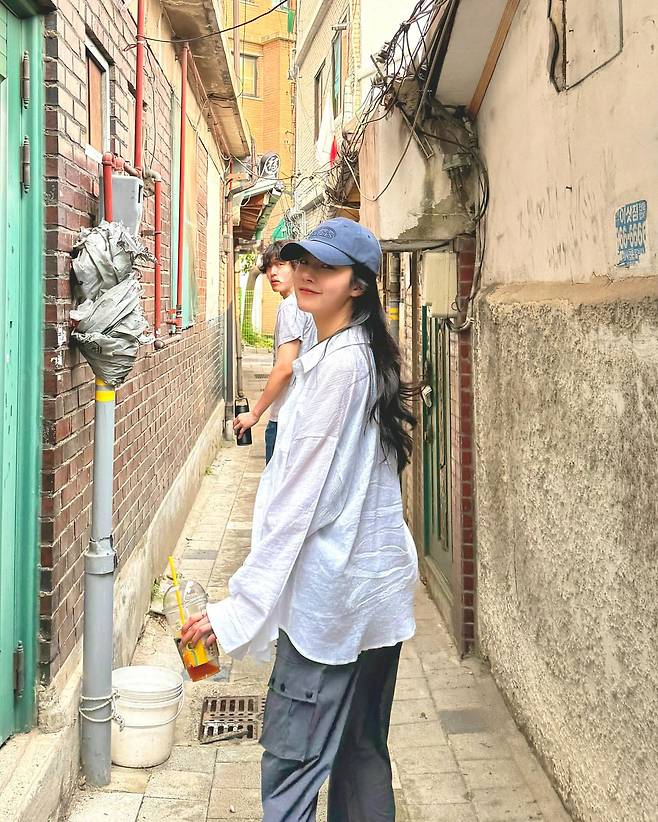 파란색 캡과 오버사이즈 화이트 티셔츠로 편안한 스트릿 스타일을 연출하고 있다. 그레이 와이드 팬츠와의 조합으로 여유로운 실루엣을 만들어내며, 한 손에 든 음료수가 일상적인 매력을 더하고 있다. 좁은 골목길을 배경으로 한 자연스러운 포즈에서 도시적이면서도 친근한 분위기를 자아내고 있다.