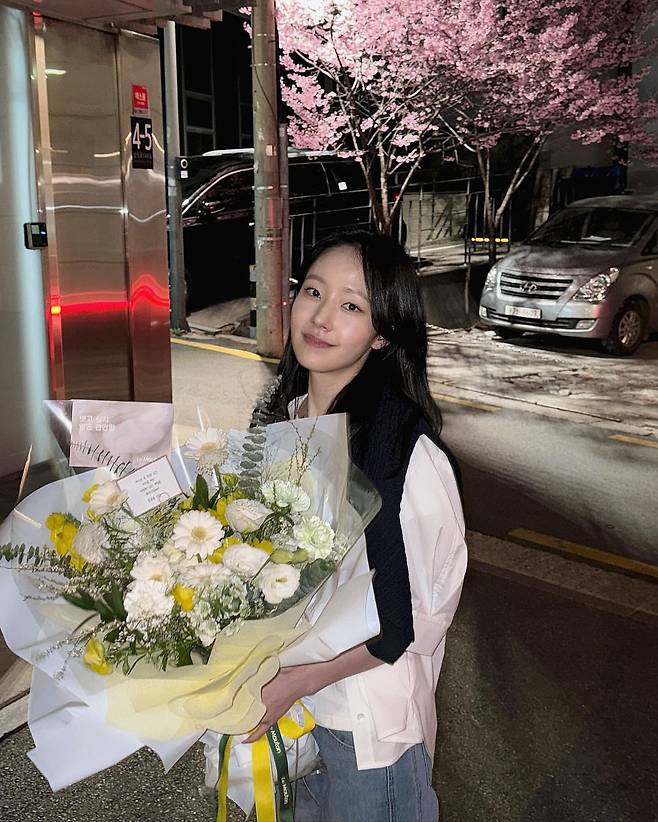 채원빈은 흰색 셔츠에 검은색 조끼를 레이어드하여 클래식한 매력을 연출하고 있다. 데님 팬츠로 캐주얼함을 더하면서도 단정한 실루엣을 완성했다. 특히 흰색과 노란색 꽃다발을 들고 있는 모습에서 봄의 로맨틱한 분위기가 물씬 풍기며, 벚꽃이 만개한 배경과 조화를 이루어 더욱 사랑스러운 룩을 완성하고 있다.