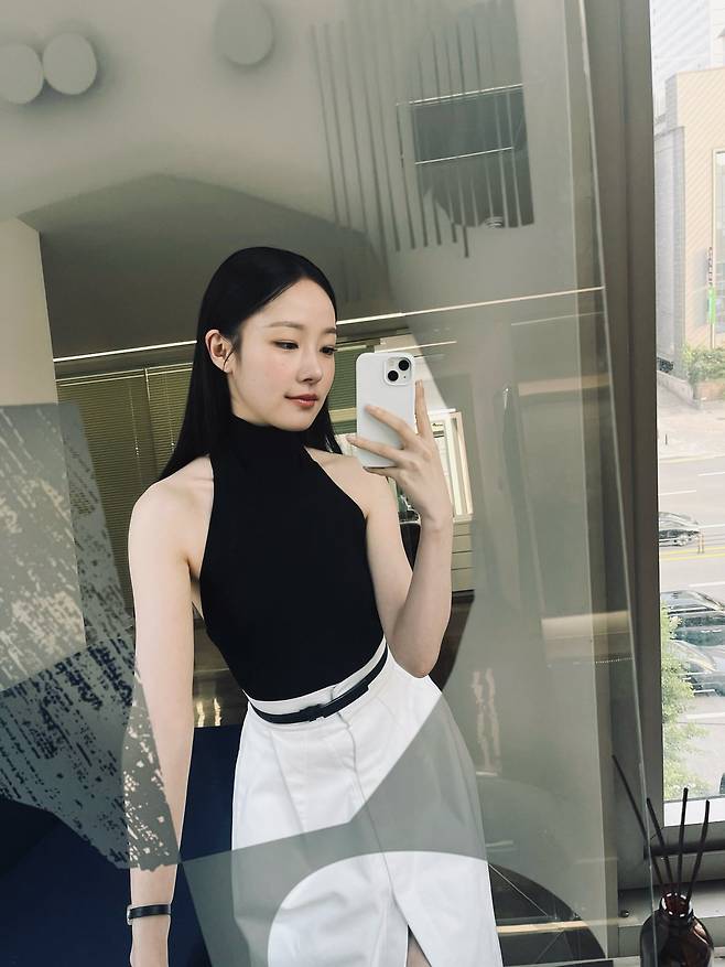 블랙 홀터넥 톱에 화이트 팬츠를 매치하여 모던하고 세련된 룩을 연출하고 있다. 블랙 벨트로 허리 라인을 강조해 여성스러운 실루엣을 완성했다. 거울 셀피를 통해 보여지는 이 스타일링은 심플하면서도 강렬한 대비를 통해 도시적이고 트렌디한 감각을 드러내고 있다.