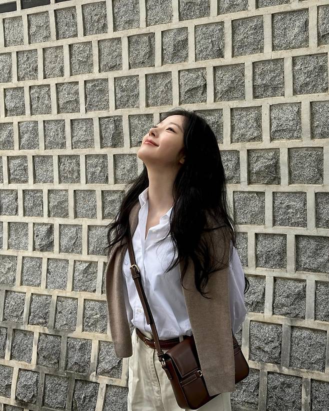 베이지 톤 니트 조끼에 화이트 셔츠를 매치한 채원빈의 스타일링이 돋보인다. 크림색 팬츠와 브라운 크로스백으로 전체적인 톤온톤 코디네이션을 연출하고 있다. 하늘을 올려다보는 포즈와 함께 자연스러운 헤어스타일이 어우러져 편안하면서도 세련된 일상룩의 완벽한 예시를 보여주고 있다.