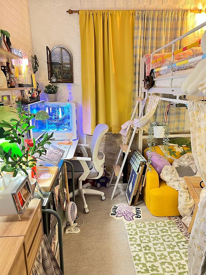 어렸을 때부터 벙커 침대의 로망이 있어서 벙커 침대를 두고 빈티지한 느낌으로 방을 꾸며보았어요. 파워 맥시멀리스트라서 공간의 벽면을 가득 채워봤습니다. 컨셉은 한마디로 '온 세상 색감이 다 있는 아지트'입니다.