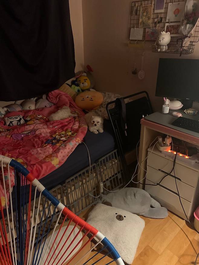 벙커 침대 아래쪽 공간이에요. 아늑하면서 아기자기한 소품을 활용하여 저만의 영화관으로 꾸며보았어요. 러그를 하나만 깔아두지 않고 2종류의 러그와 하나의 발매트를 두어서 더욱 재미를 주었습니다. 방구석 영화관을 만들고 싶어서 침대 밑으로 빔프로젝터와 빔 스크린을 설치해두었어요.